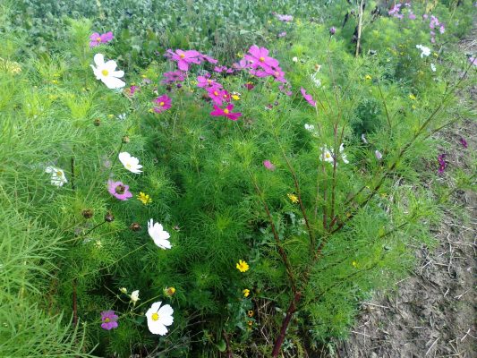 Eenjarig mengsel Samenstelling: Boekweit, Gele kamille, Korenbloem, Saffloer, Bolderik, Gipskruid, Koriander, Zonnebloem, Groot akkerscherm, Chrysant, Luzerne, Zomertarwe, Cosmea, Hoofdjes Gilia, Meisjesogen, Gierst, Gele ganzenbloem, Klaproos, Phacelia.